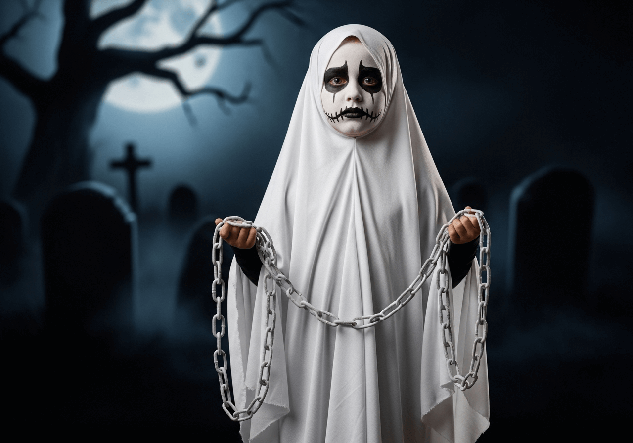 For a look that’s both simple and spooky, ghost makeup is a classic choice for Halloween. Use white face paint to create a ghostly appearance and add some black eyeliner around the eyes to give your child that eerie look. You can even add a sheet or some chains for accessories, completing the ghost look. It’s fast, easy, and perfect for those last-minute costume needs.