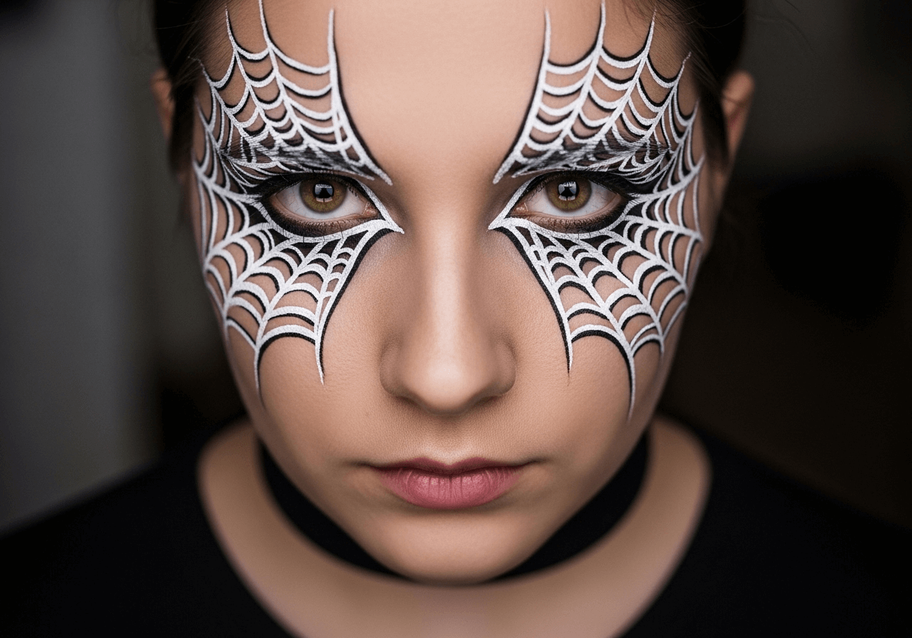 If you're running short on time and need something quick, a spider web design around the eyes is a fun and spooky choice. All you need is a white eyeliner pencil or face paint to create the web, and you’re done! Pair it with a black outfit, and you’ve got a last-minute Halloween makeup look that’s both spooky and stylish. This design works for both kids and adults, so you can rock it together!